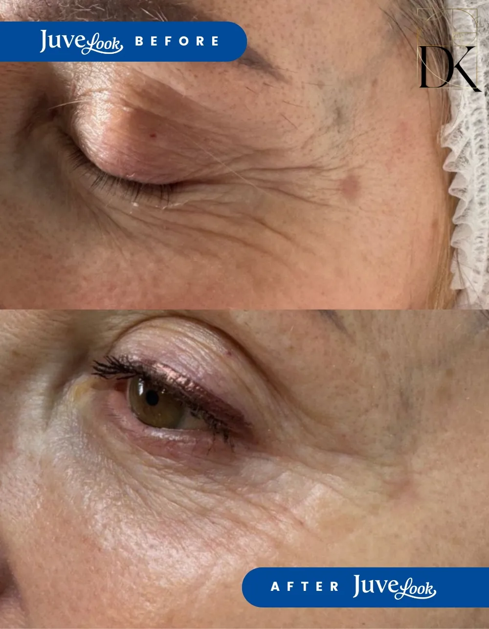 Ефект: Juvelook (Джувелук) - допомагає зволожити шкіру під очима, усунути темні кола, зменшити зморшки та поліпшити загальний тонус шкіри. Запатентовані мікрочастинки PDLA від Juvelook - це єдиний на ринку препарат на основі полімолочної кислоти, який підходить для делікатних ділянок під очима. Процедура спрямована на поступове і природне відновлення молодості шкіри навколо очей шляхом поповнення запасу вологи і збільшення колагену.